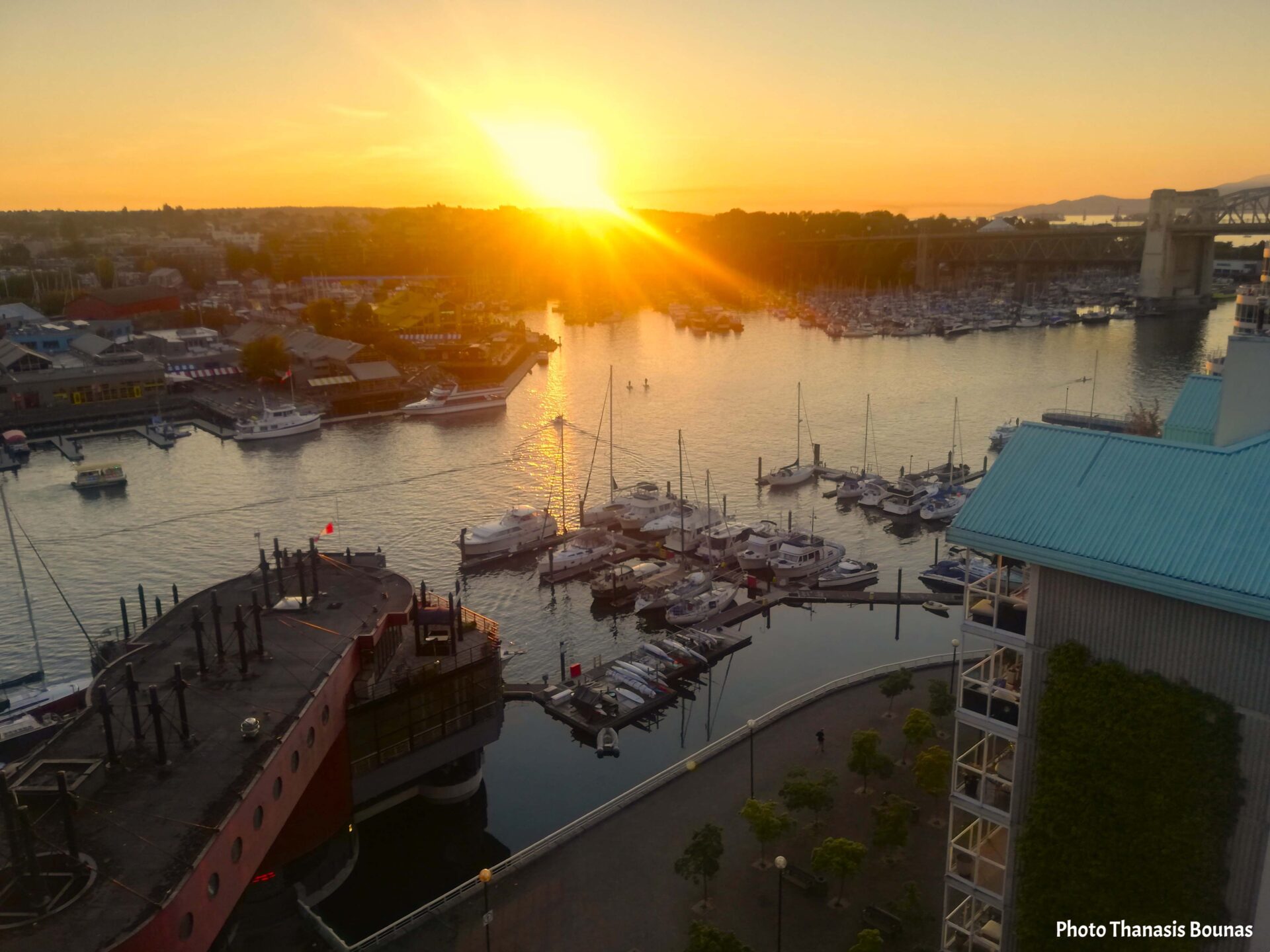 Sunset over Granville Island and the marinas of False Creek, seen from Granville Bridge in Vancouver – Photo by Thanasis Bounas.